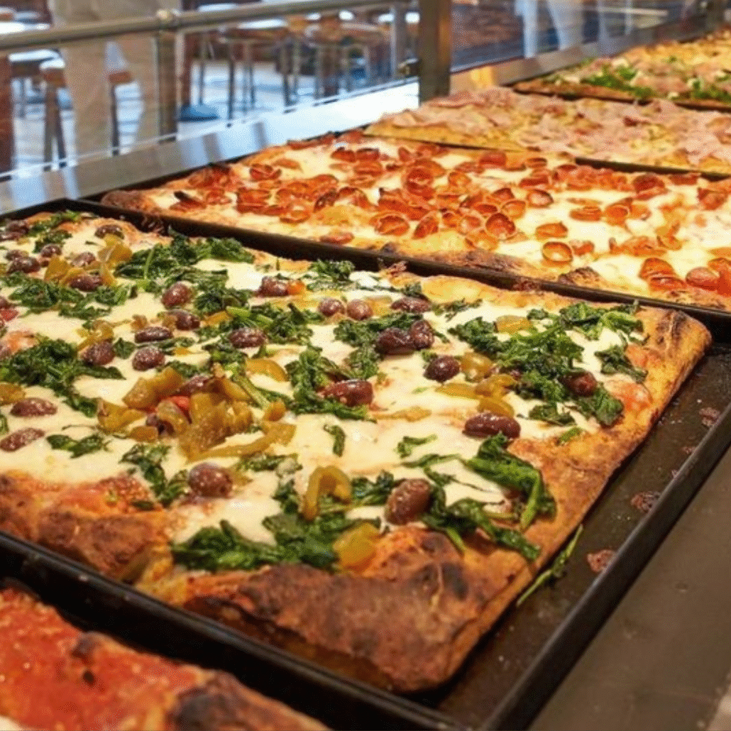 Pizza al taglio (literally “pizza by the cut”) is a style of pizza that originated in Rome’s bakeries and street food shops. Unlike Neapolitan pizza, which is round, thin, and baked in seconds at extreme heat, pizza al taglio is rectangular, thick, and baked in large trays (teglia) at a more moderate temperature for a longer time.
